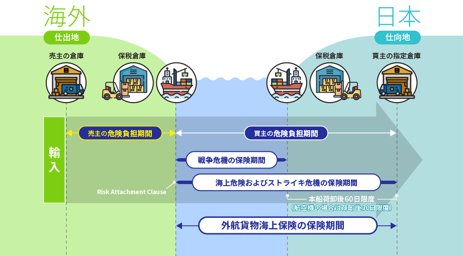 買主である輸入者が保険手配する場合等は、Risk Attachment Clauseを適用し、危険負担が売主から買主に移転したときを保険始期とします。